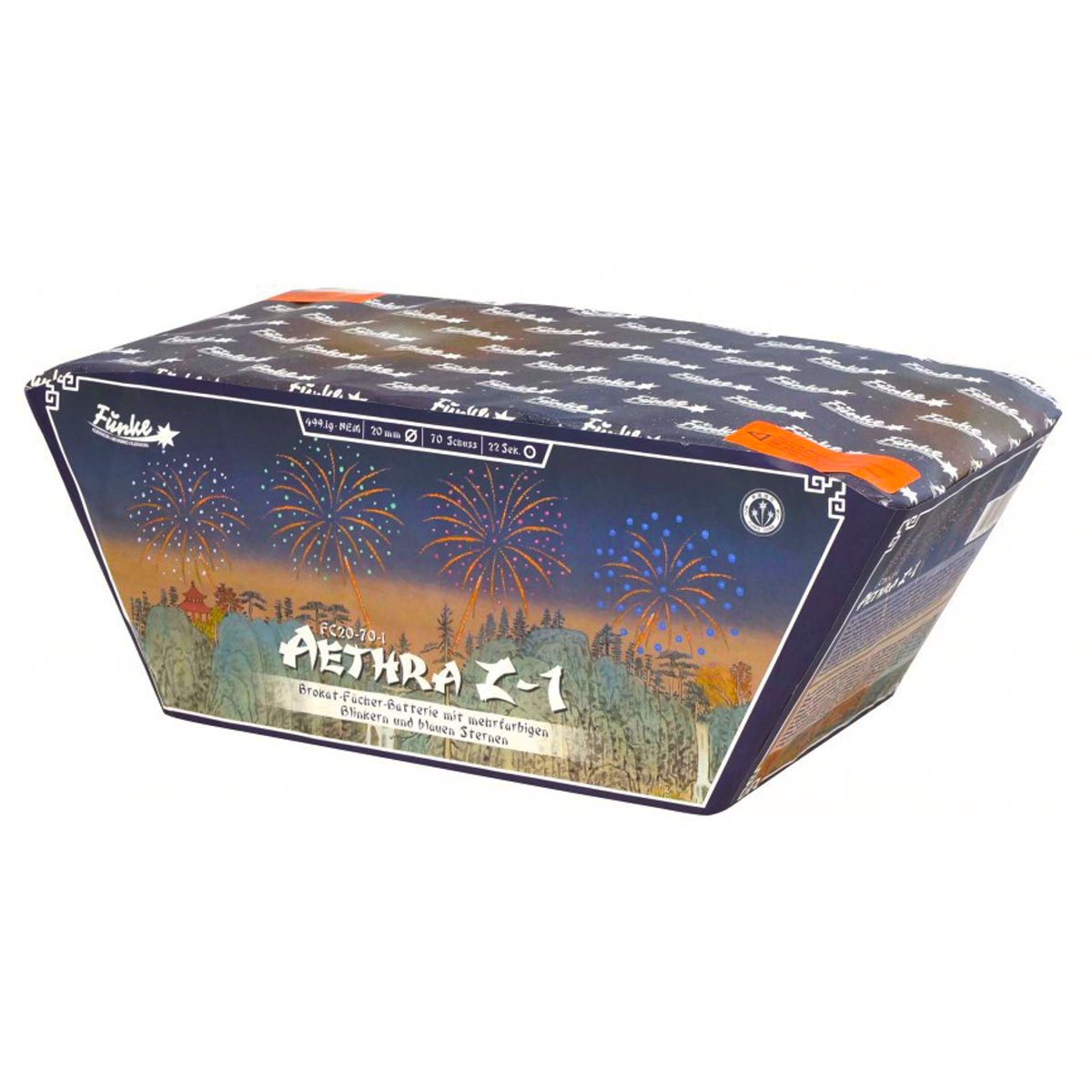 Die Funke Aethra ist eine 70 Schuss Fächerbatterie mit einem Kaliber von 20 mm. Die 70 Schuss werden in 20 Sekunden mit rasanter Schussfolge abgegeben und entfallten in 35 m Höhe Brokatkronen mit weißen Blinkernsternen, grünen Blinkersternen, roten Blinkersternen und blauen Sternen.
