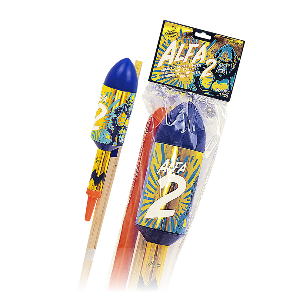 Die Funke Alfa 2 ist eine sehr schöne F3 Rakete 165 g NEM und eine Steighöhe von 80 m sprechen für sich. Ein Goldschweif Aufstieg zerlegt sich am Himmel zu einer wunderschönen Goldtitanweide mit blauen Sternen.
