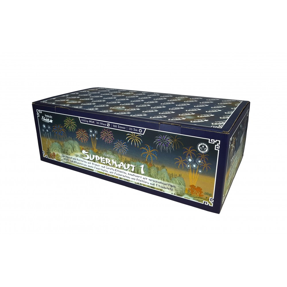 Verbundfeuerwerk-Sortiment mit 288 Schuss im Kaliber 20-30mm und einer Satzmenge von 3834,5g, mit Brokat- und Corolla-Effekten, kombiniert mit verschiedenartigen Farb- und Blinksternen sowie Feuertöpfen, mit Fächersalven aus Pfeiffern und Titansaluts.