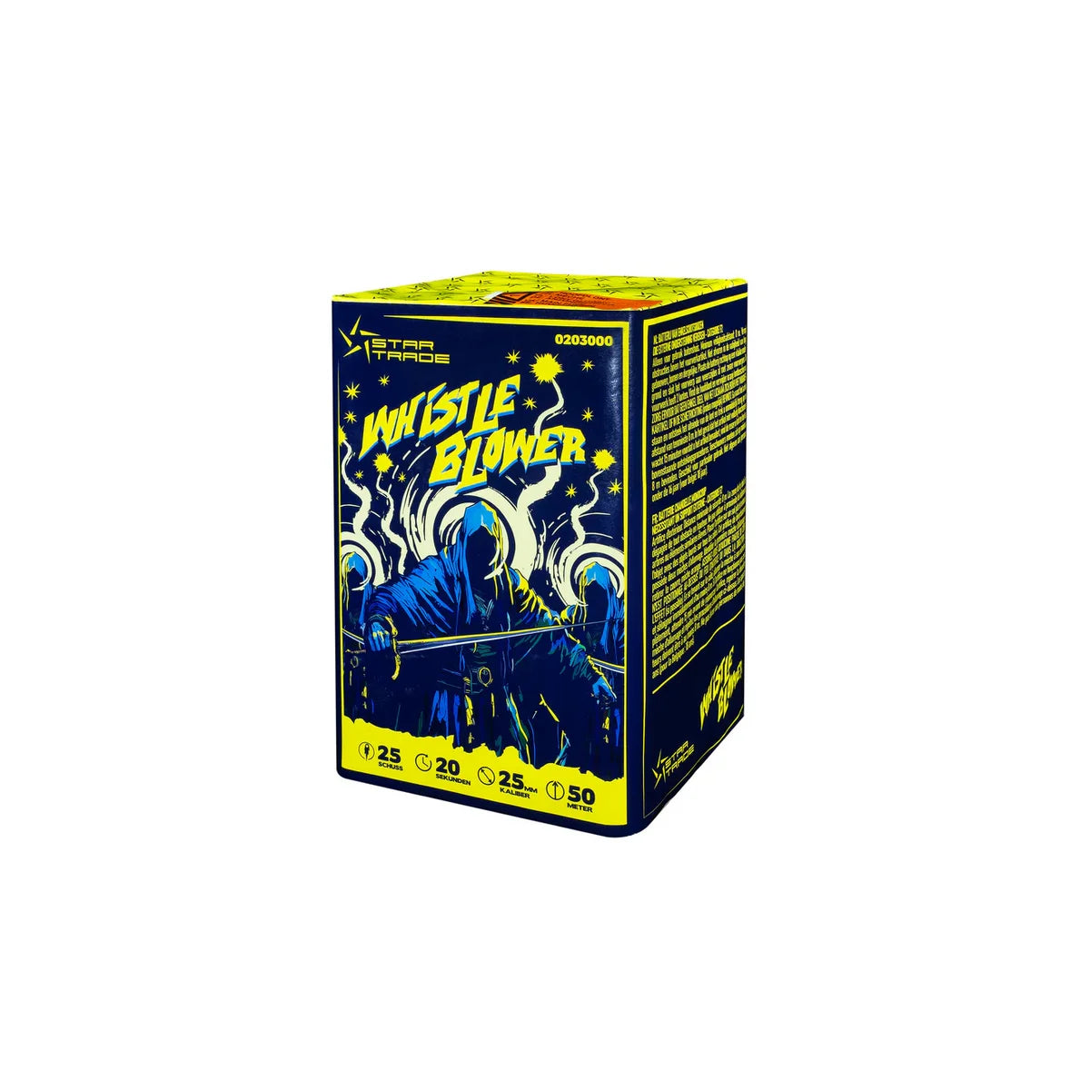 Nur im Freien verwenden! Hindernisse über der Mündung vermeiden. Nicht in der Nähe von hohen Gebäuden, Bäumen oder Ähnlichen abschießen. Die Batterie ist auf ebenen Boden zu stellen und der Gegenstand ist dicht zu allen Seiten mit schweren Gegenständen zu umgeben. Dieser Feuerwerkskörper hat zwei Anzündungen. Erste Anzündung identifizieren und orange Schutzabdeckung entfernen. Anzündschnur seitwärts stehend am äußersten Ende anzünden und sich sofort mindestens 8 m entfernen. Falls der Feuerwerkskörper seine Funktion nicht vollständig erfüllt, 15 Min. warten, danach zum Feuerwerkskörper zurückkehren und die Ersatzanzündschnur seitwärts stehend am äußersten Ende anzünden, wobei SICHERZUSTELLEN IST, DASS SICH KEIN KÖRPERTEIL ÜBER DEM FEUERWERKSKÖRPER BEFINDET und sich sofort mindestens 8 m entfernen. Abgabe an Personen unter 18 Jahren verboten.